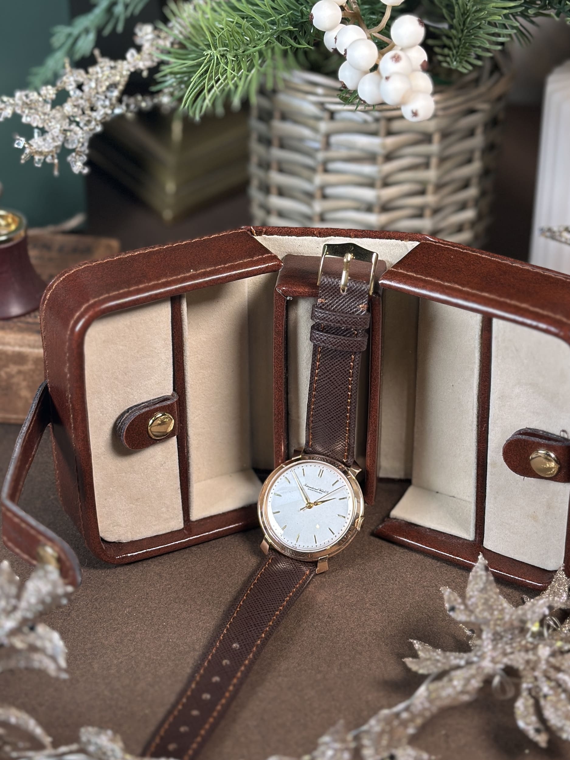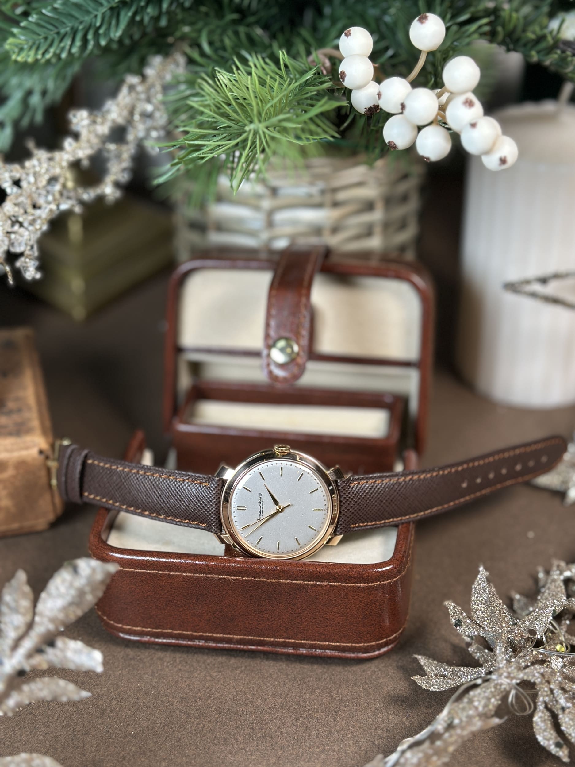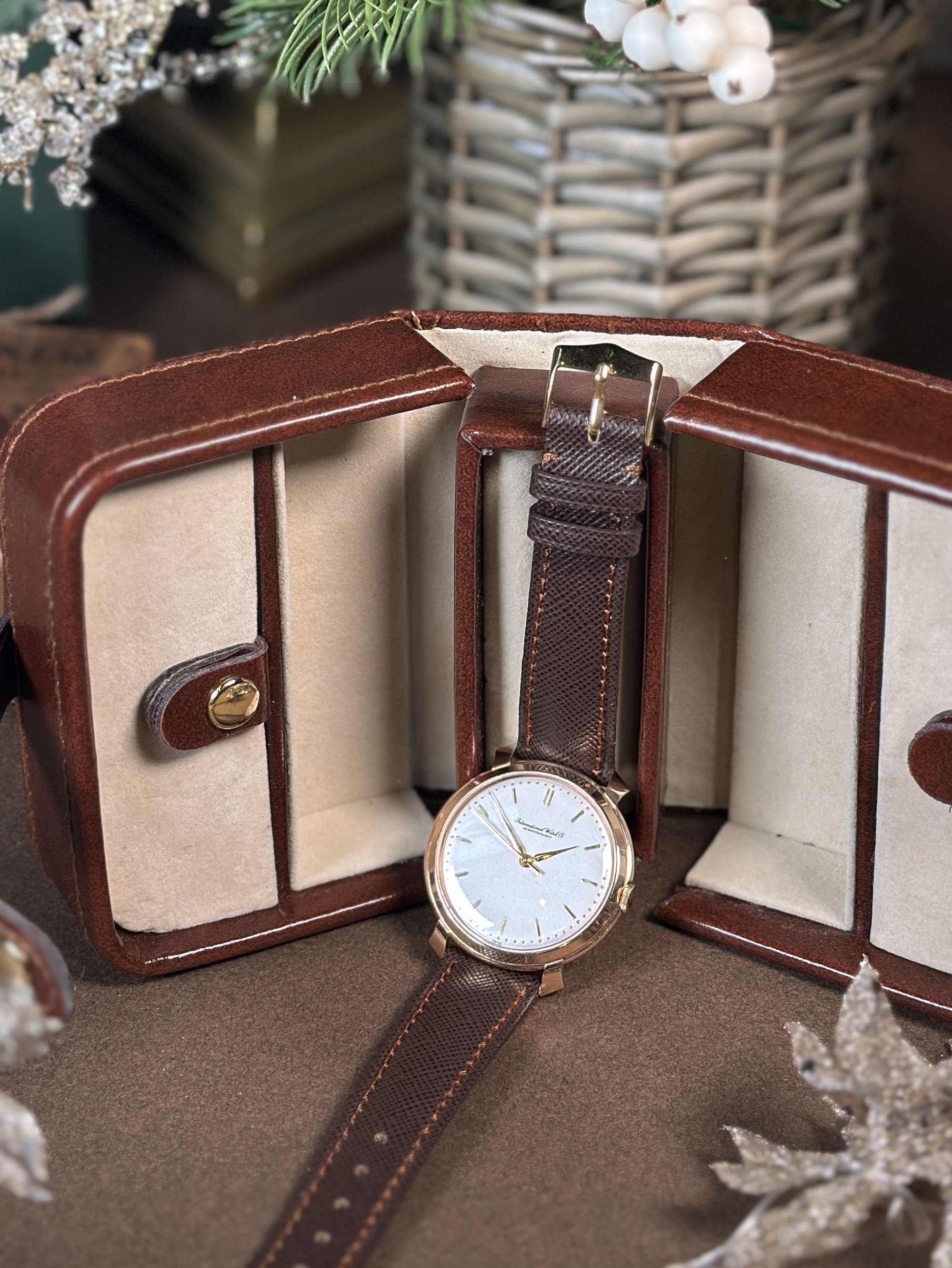 The so-called “jumbo” IWC dress watches of the 1950s occupy a special place in the brand’s post-war catalogue. At 36–37 mm, they were significantly larger than the typical gentleman’s watches of the period, giving them a contemporary feel long before larger cases became fashionable. The use of 18ct rose gold was comparatively uncommon for IWC at the time, and the warm alloy pairs beautifully with the expansive dial layouts of this era.