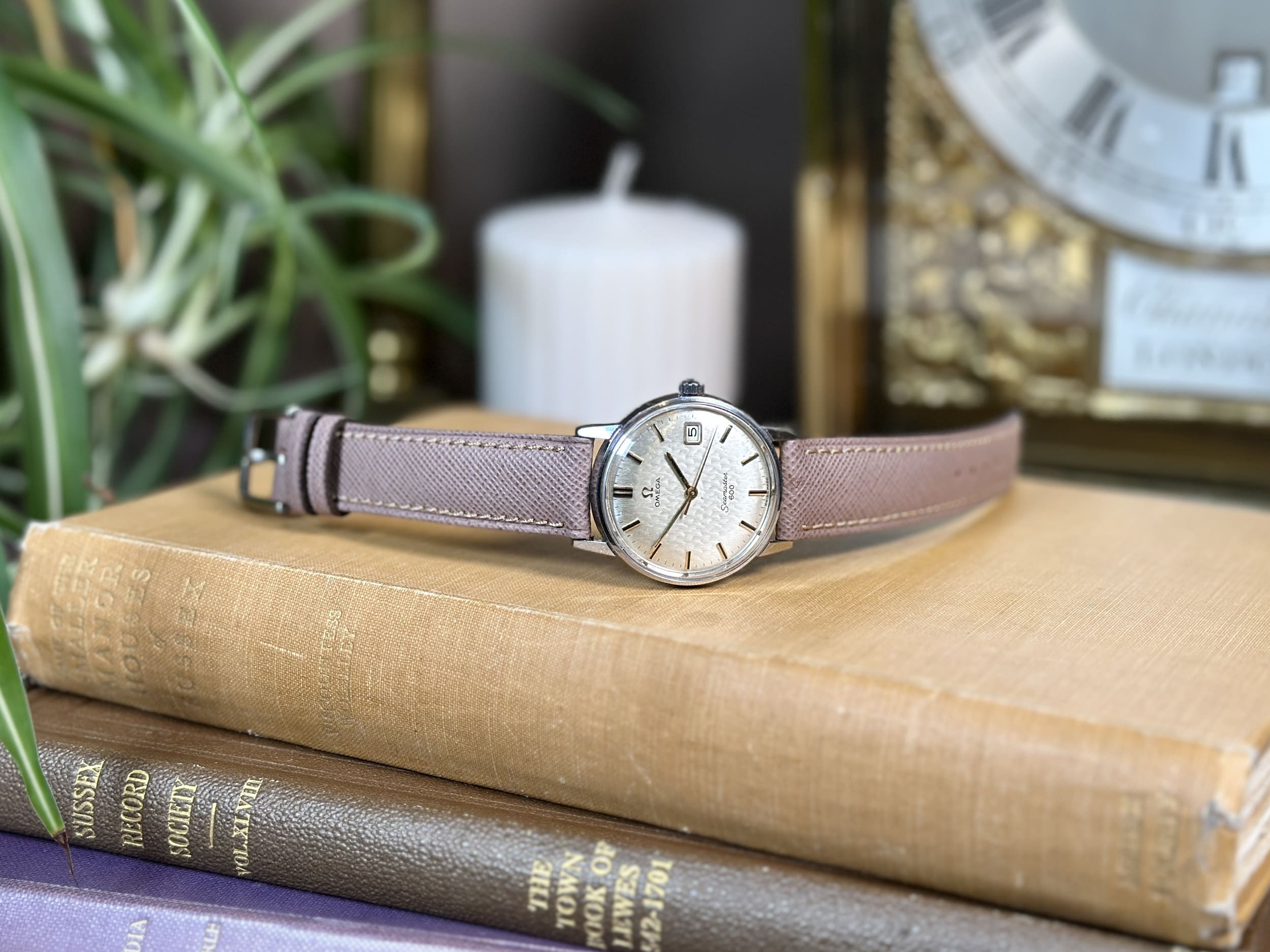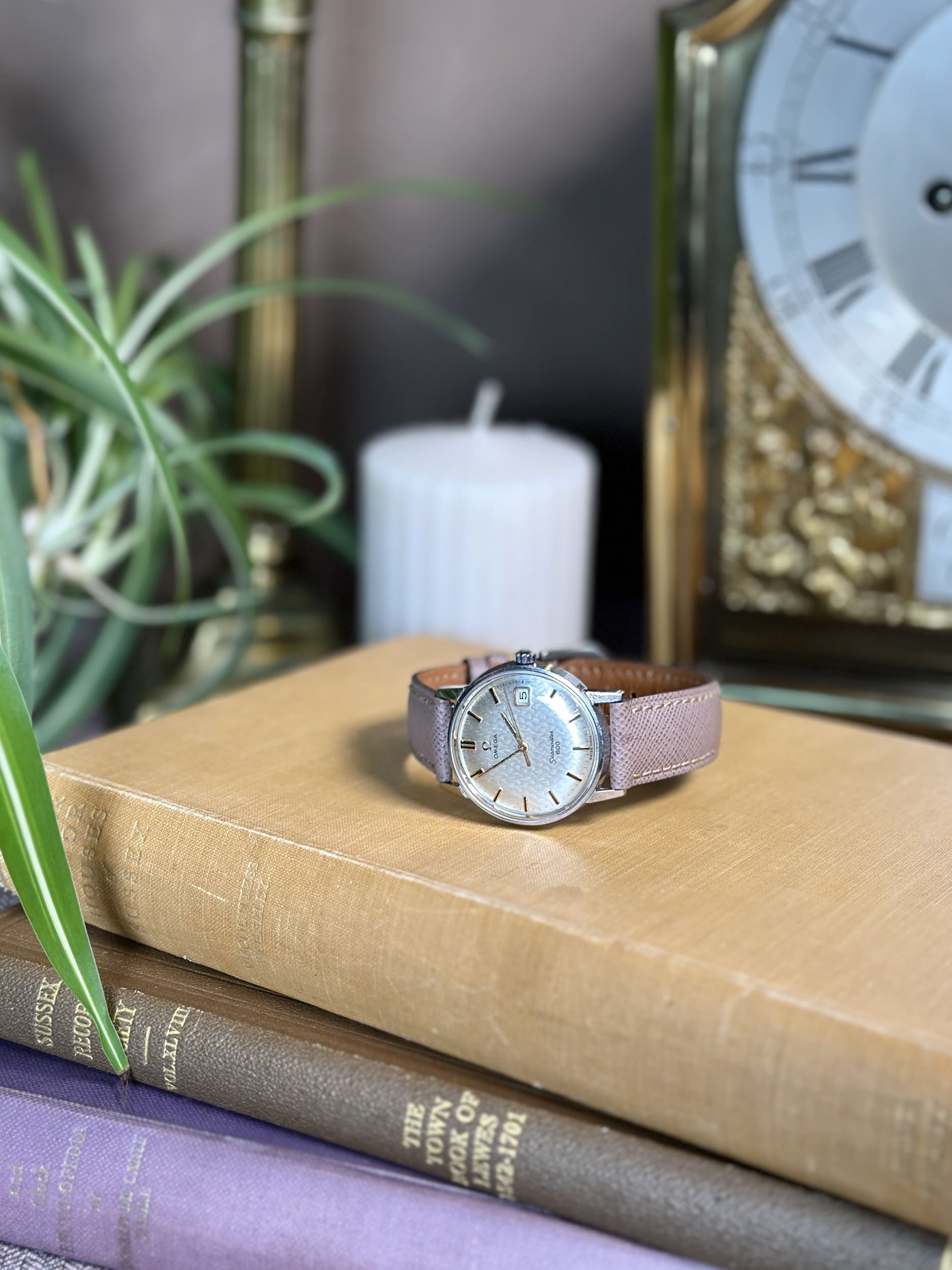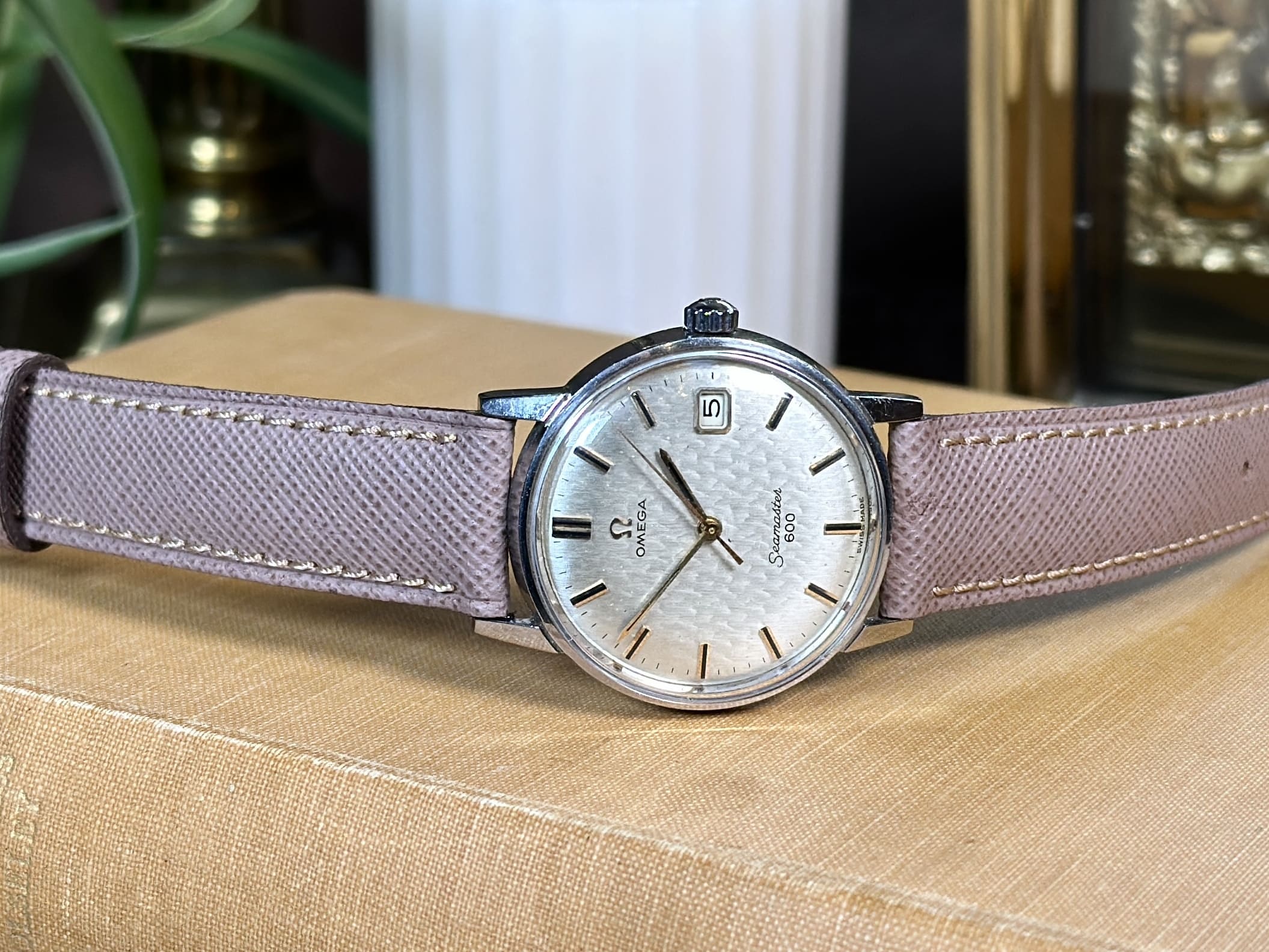 This particular example, distinguished by its silvered fish-scale (or “guilloché”) dial, is a rarer and more decorative variant within the series. The textured pattern plays with the light, giving the watch remarkable depth and shimmer when viewed from different angles — a subtle nod to the marine inspiration of the Seamaster name. Paired with applied indices and dauphine or baton hands, it captures the quiet refinement of 1960s Omega design before the sportier tool-watch era took hold. Today, such dials are prized by collectors for their distinctive artistry and the way they elevate a simple hand-wound Seamaster into a piece of mid-century horological charm.