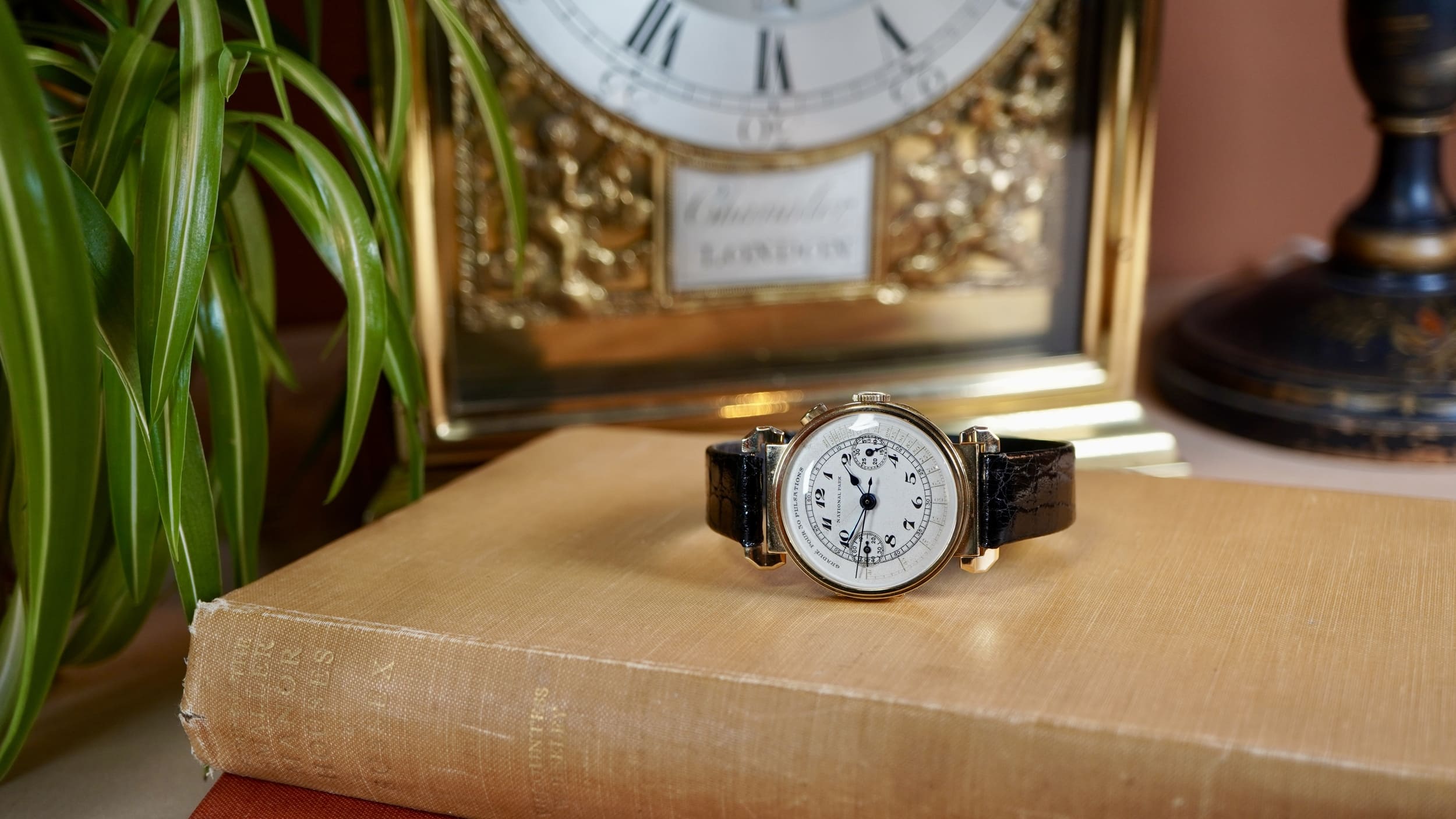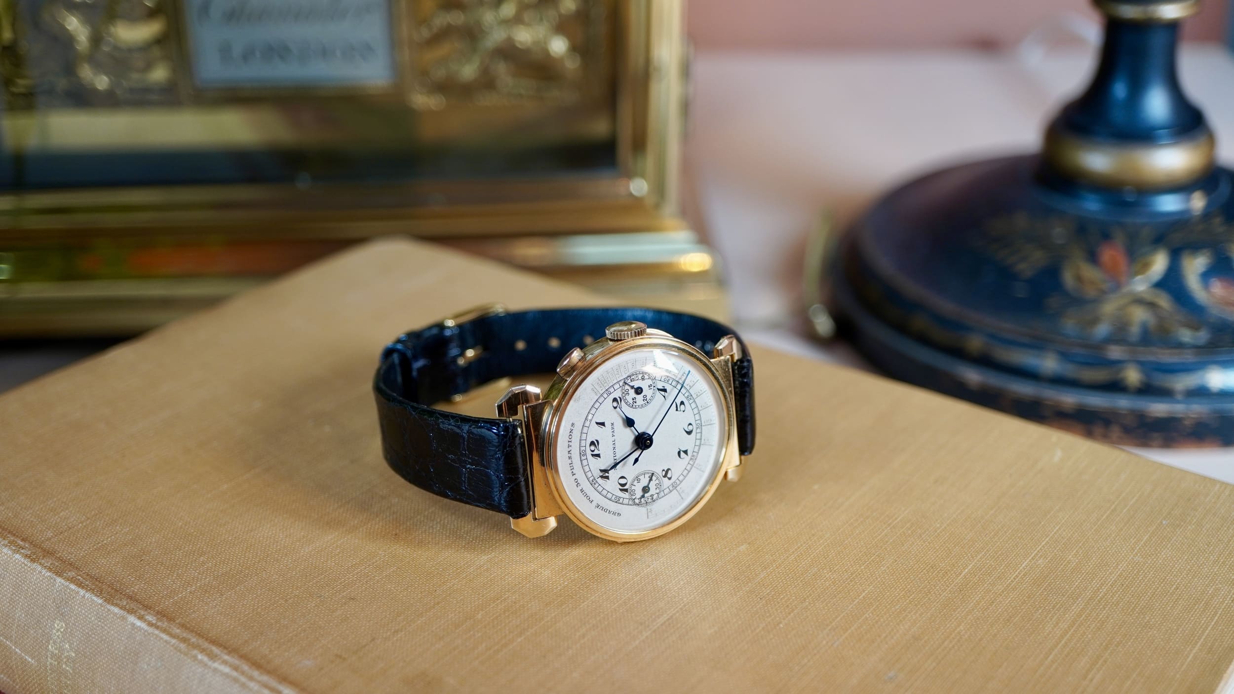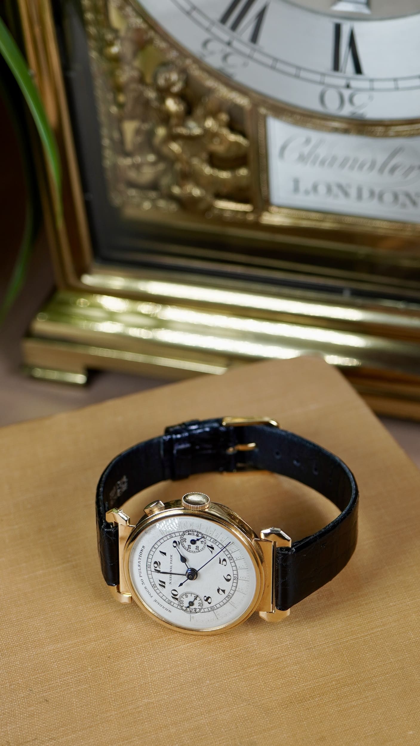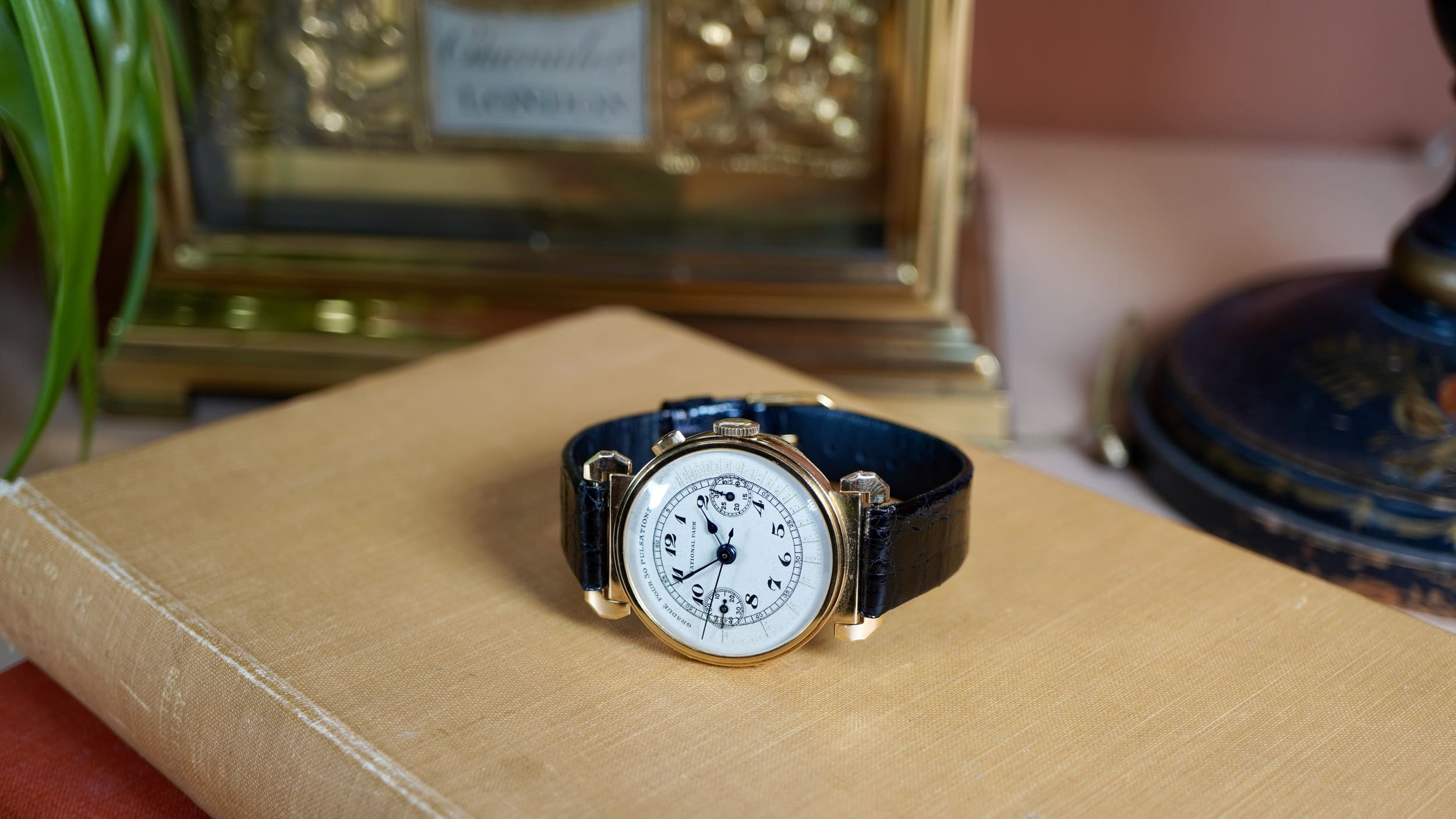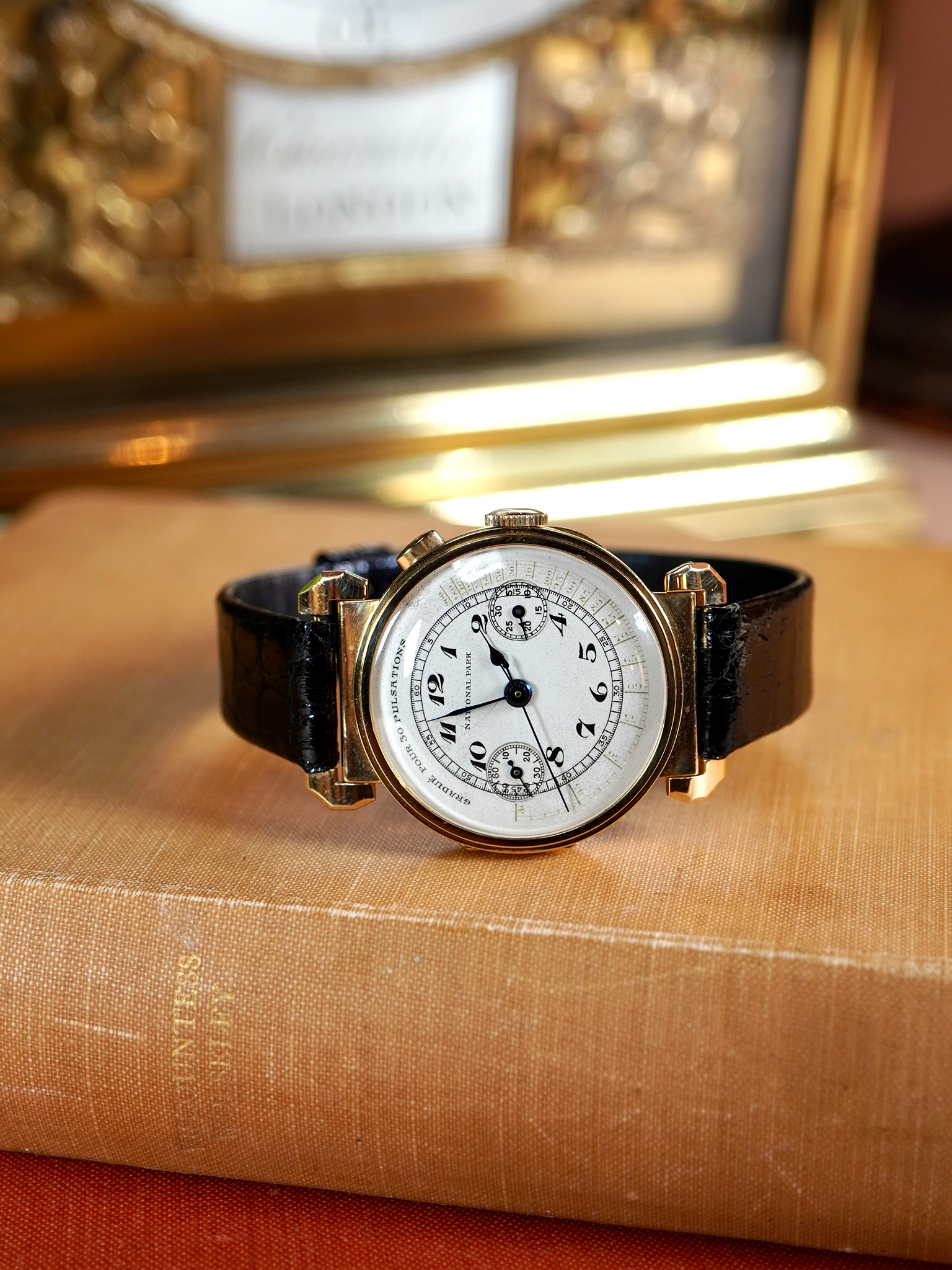 The dial is fitted with blued steel hands and features raised enamel Arabic numerals, giving the surface a distinctive depth and clarity characteristic of quality dials of the period. It is printed with a “Gradue pour 30 Pulsations” pulsemeter scale, intended for medical use. By starting the chronograph and counting thirty heartbeats, the central chronograph seconds hand indicates the pulse rate directly on the scale. Such medical dials illustrate the growing relationship between precision wrist chronographs and professional practice in the early twentieth century. During this period Universal Genève was establishing a strong reputation for complicated wrist chronographs, and the firm’s Compur models represent some of the earliest and most elegant wrist chronographs produced during the formative decades of the wrist-worn chronograph.