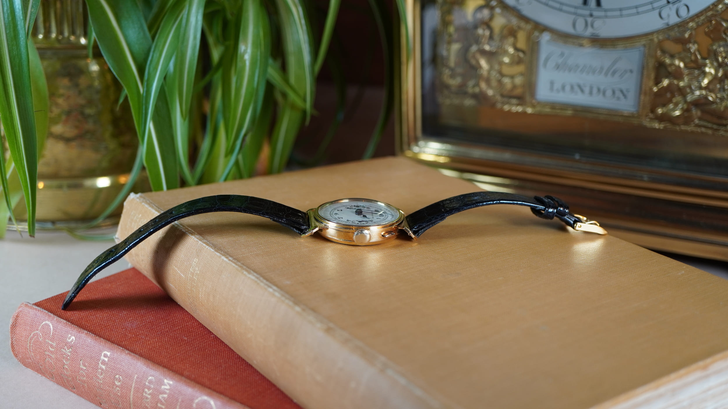 A particularly attractive 1930s 18ct gold Universal Genève Compur chronograph, distinguished by its refined proportions and technically interesting configuration. The locally-made 18 carat gold case is notably heavier than standard Swiss export examples, reflecting the practice of supplying movements for casing in specific national markets where higher gold standards and thicker cases were often preferred. It features articulated lugs, a design occasionally encountered in the inter-war period intended to improve comfort on the wrist at a time when wristwatches were still evolving from pocket watch forms. The case houses a single-button chronograph (monopusher) mechanism operated through the crown, controlling the start, stop and reset functions in sequence.