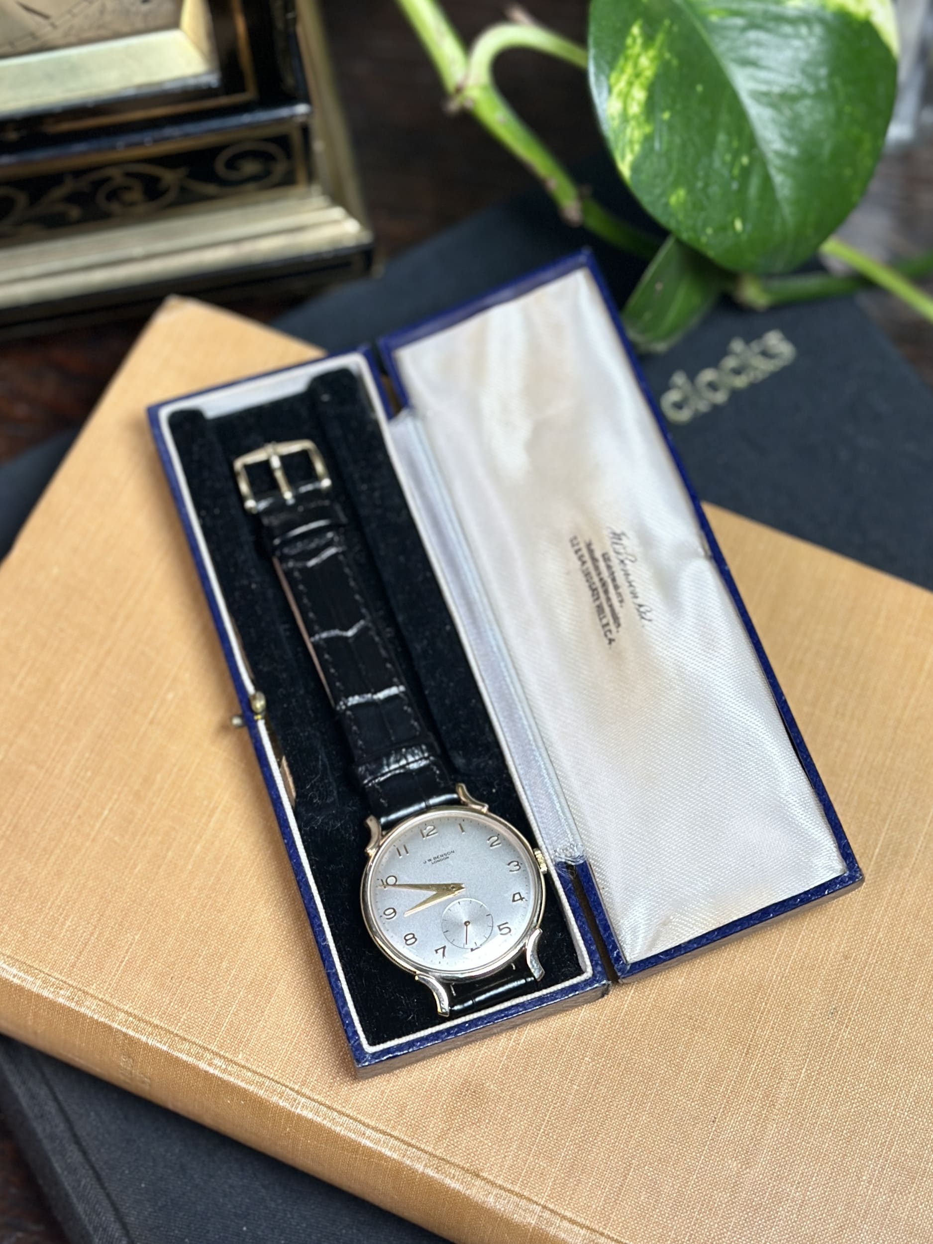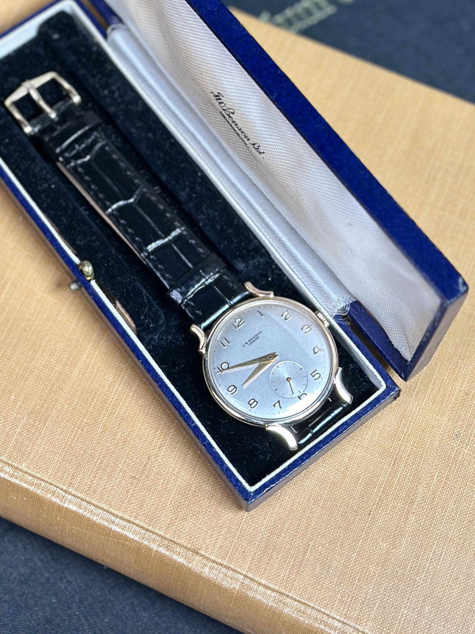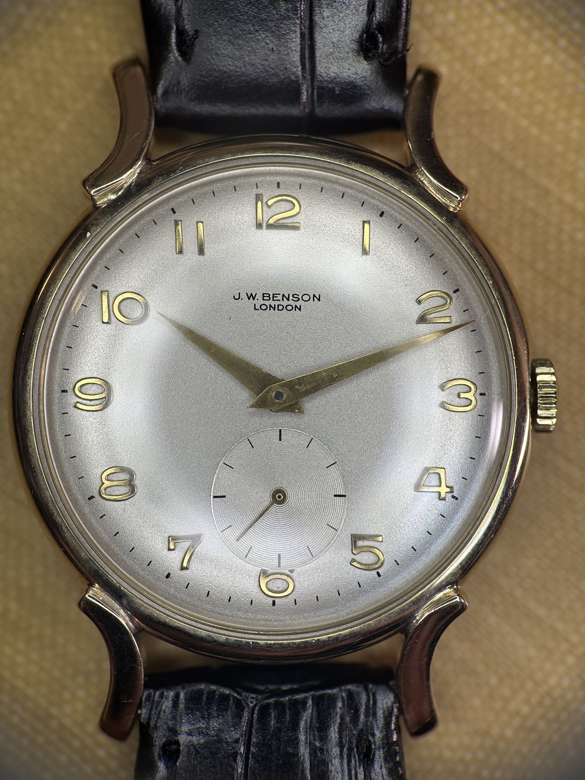 The J.W. Benson sub-seconds wristwatches of the 1950s reflect the final flowering of traditional British watch retail before the industry’s sharp post-war contraction. Benson, long established as one of Britain’s most prestigious watch retailers, commissioned high-quality movements and cases to its own specifications, often favouring refined, conservative designs aimed at a discerning domestic clientele. This example, housed in a solid 9-carat gold case with decorative frilled lugs, captures the era’s distinctly British aesthetic—elegant, slightly ornate, and unapologetically formal—at a time when Swiss watches were becoming increasingly dominant.