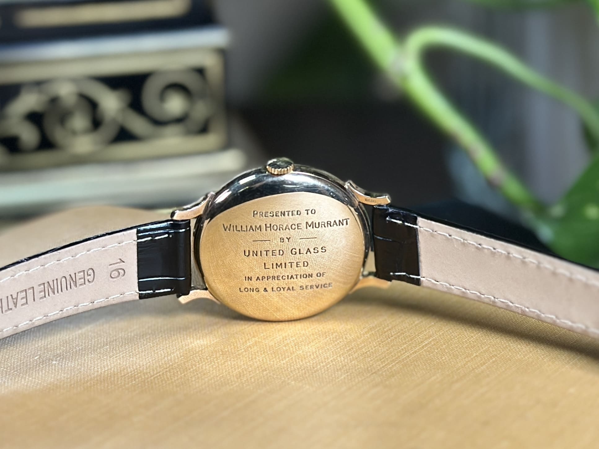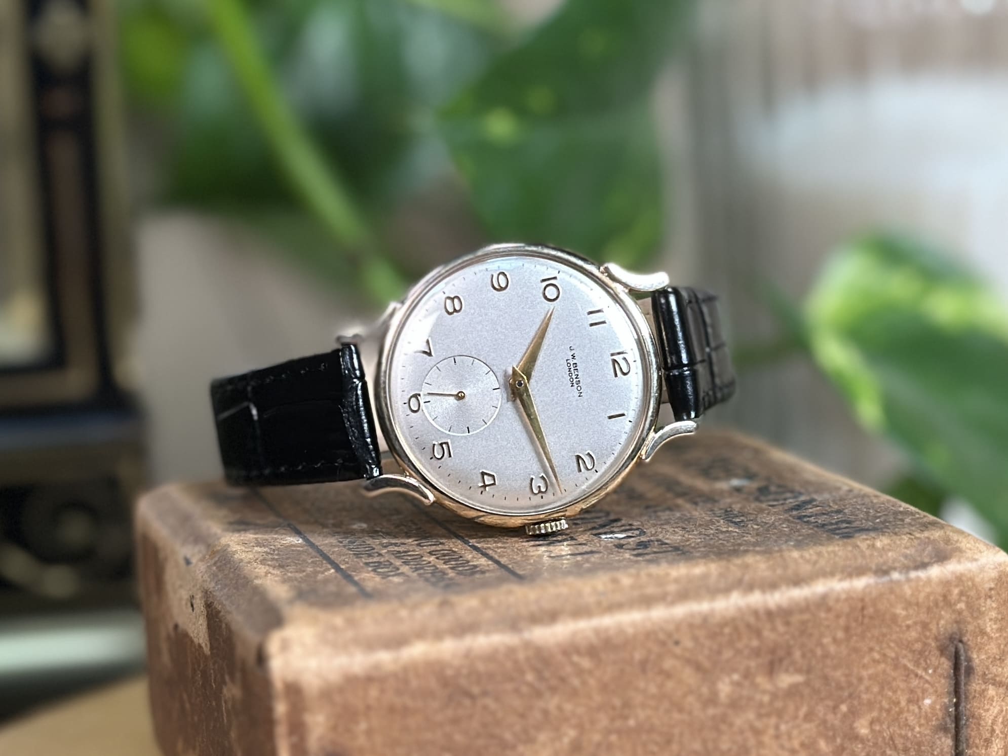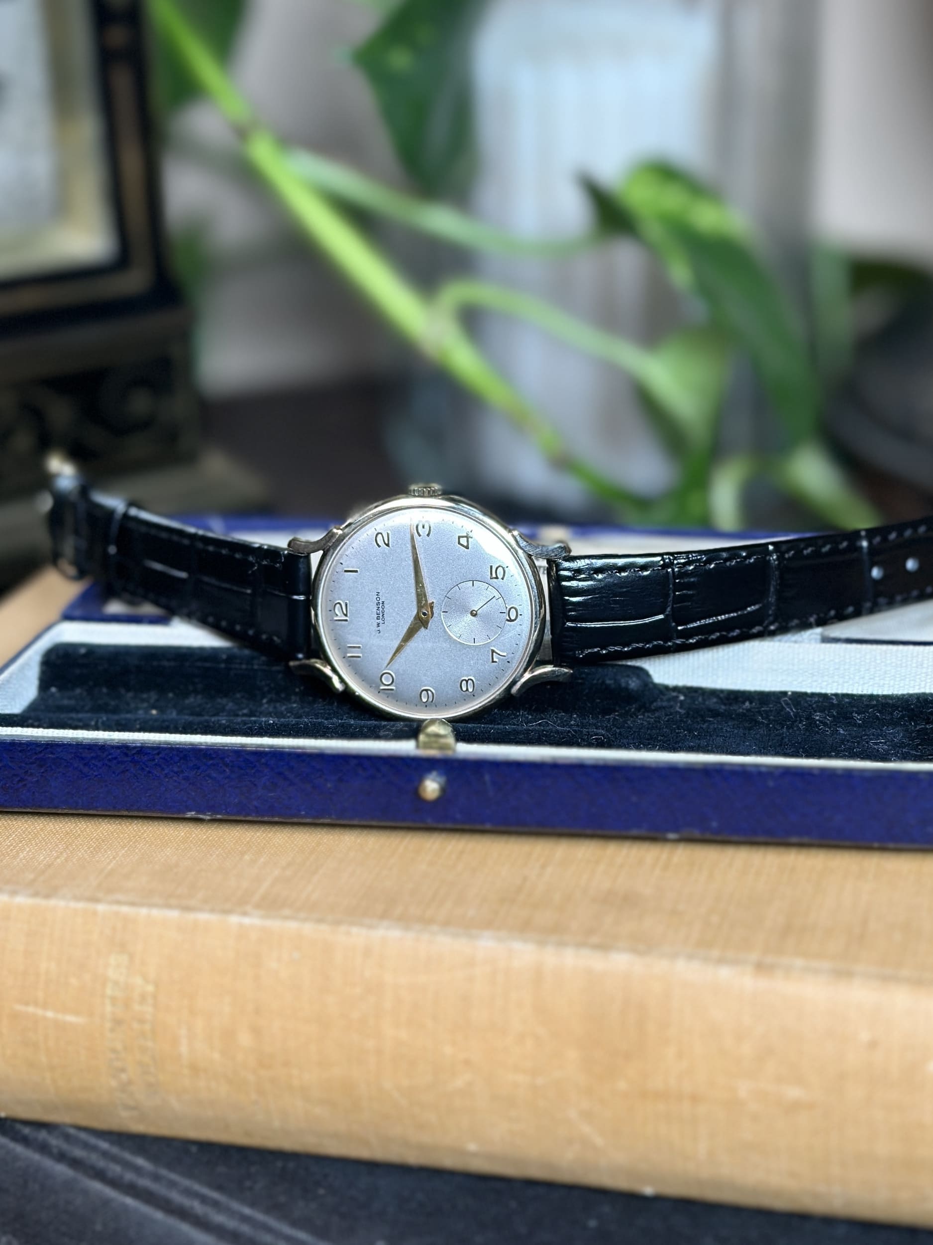 The J.W. Benson sub-seconds wristwatches of the 1950s reflect the final flowering of traditional British watch retail before the industry’s sharp post-war contraction. Benson, long established as one of Britain’s most prestigious watch retailers, commissioned high-quality movements and cases to its own specifications, often favouring refined, conservative designs aimed at a discerning domestic clientele. This example, housed in a solid 9-carat gold case with decorative frilled lugs, captures the era’s distinctly British aesthetic—elegant, slightly ornate, and unapologetically formal—at a time when Swiss watches were becoming increasingly dominant.