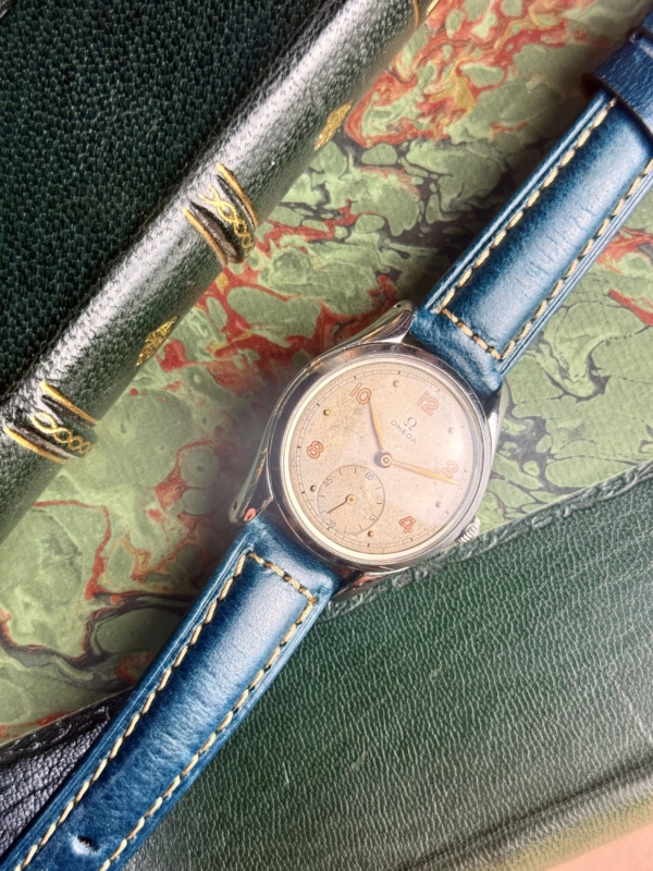 The 1950s Omega Sub-Seconds timepieces are celebrated for their distinctive dial designs and reliable mechanics. A particularly rare and sought-after variant features Arabic numerals at the 12, 2, 4, 8, and 10 o’clock positions, interspersed with dot markers at the odd hours, all in rose gold. This unique configuration offers a harmonious blend of numerals and indices, enhancing both aesthetics and legibility.