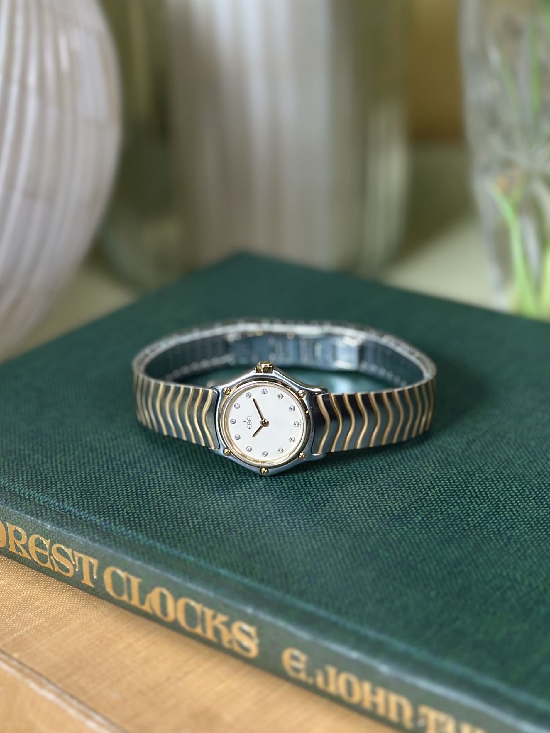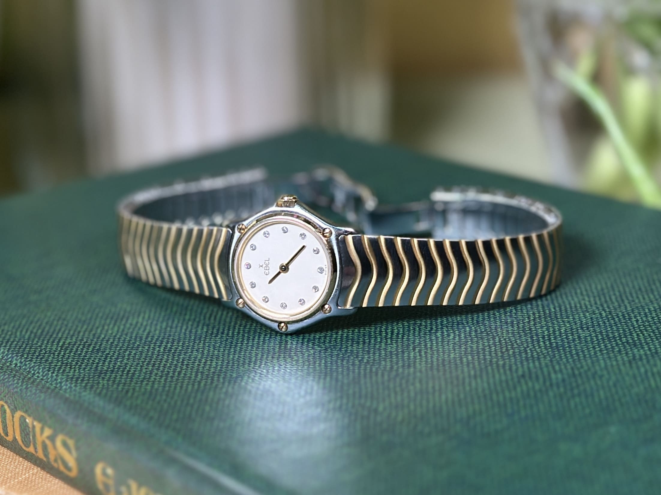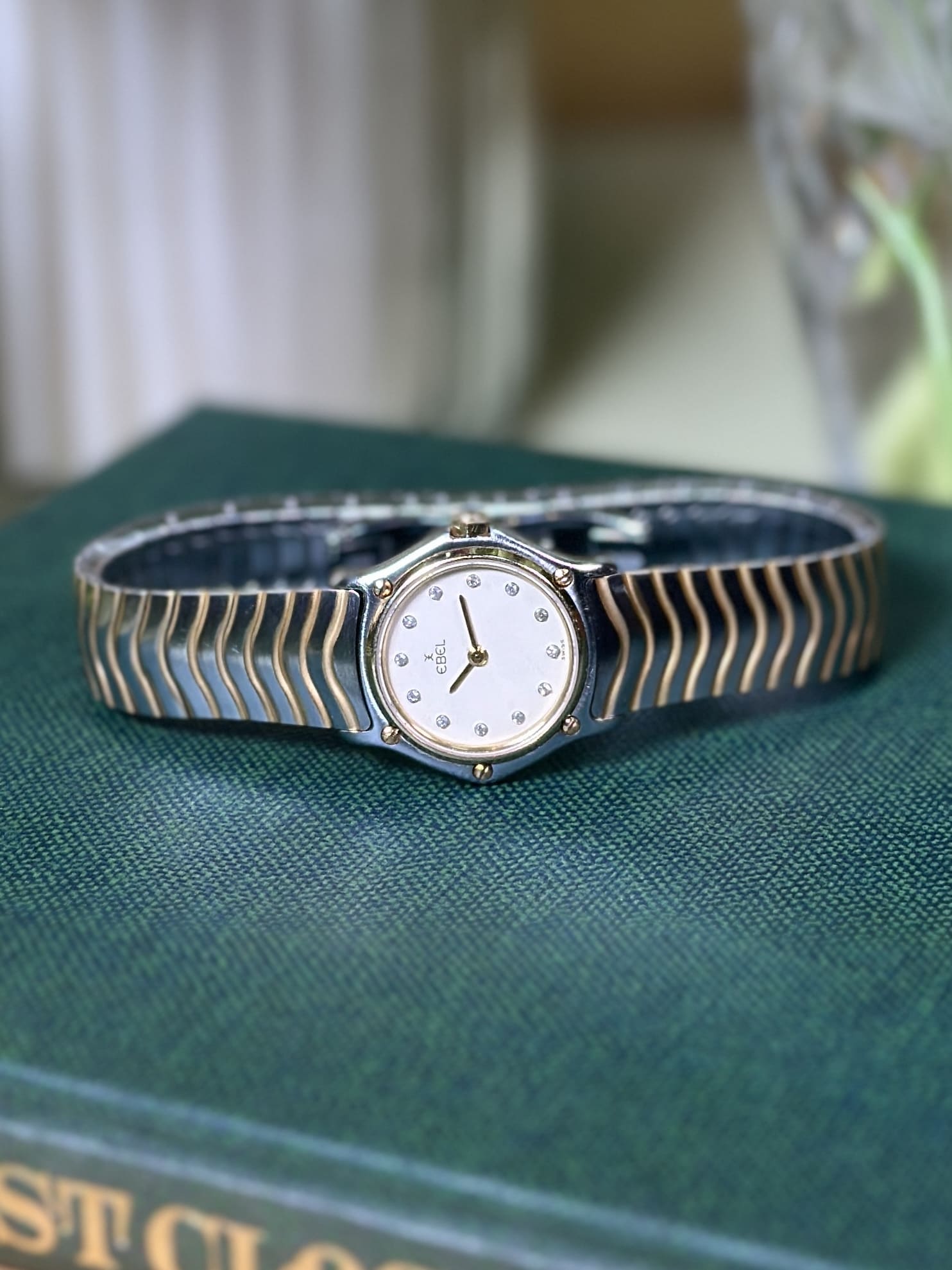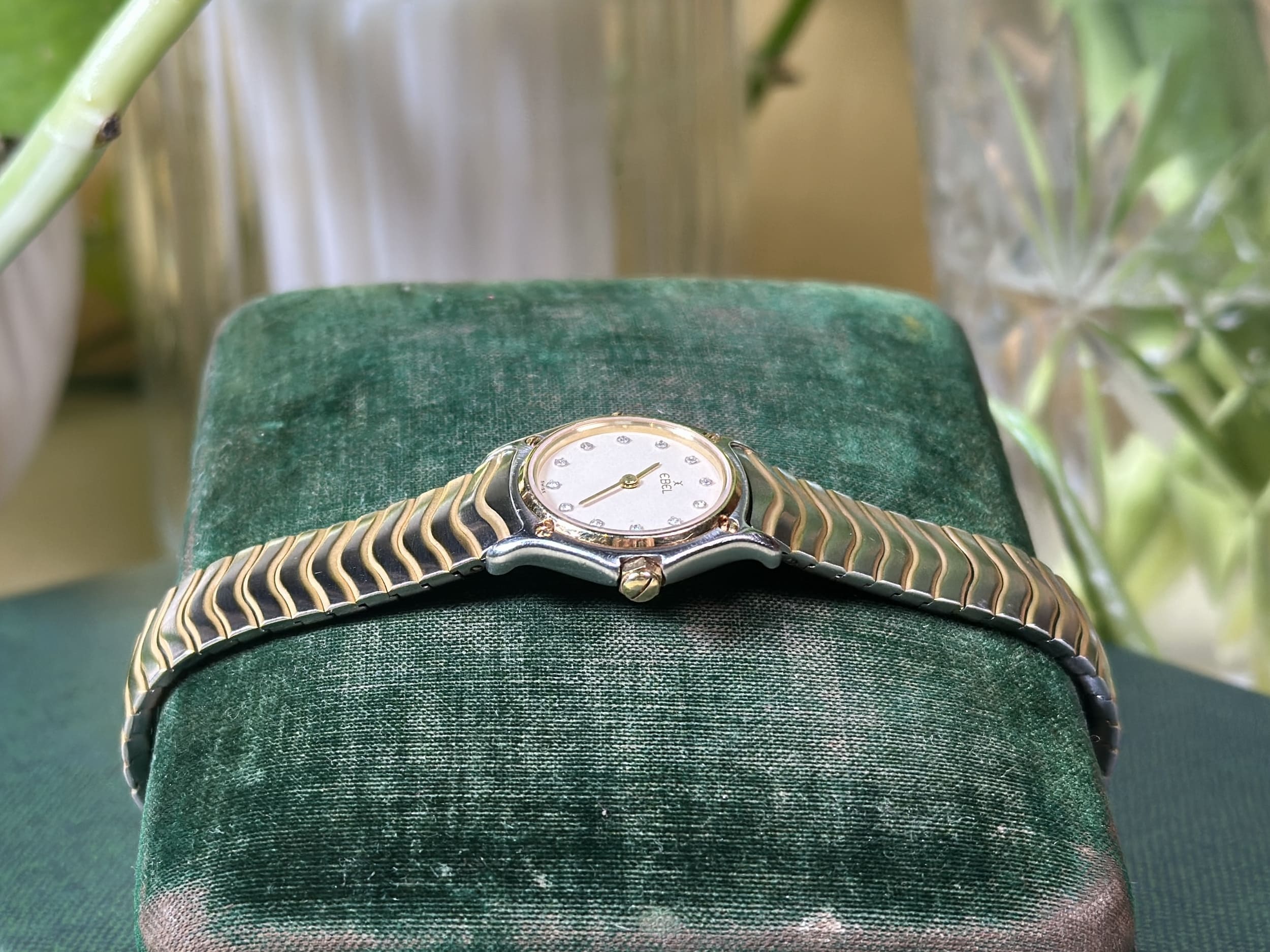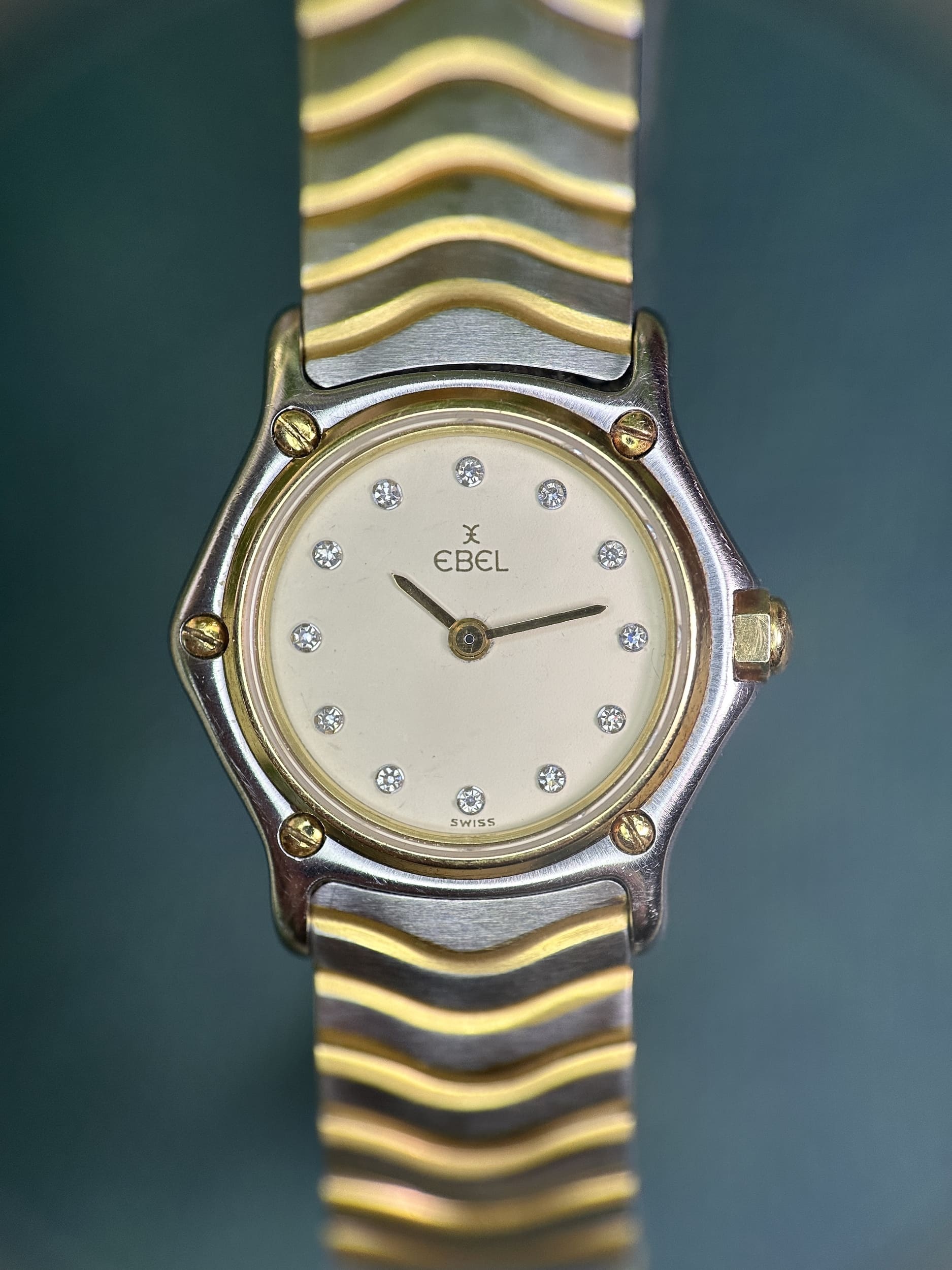 This ladies’ Sport Classic example, with its compact 23 mm stainless-steel case and solid 18-carat yellow-gold bezel, reflects Ebel’s mastery of bi-metal design at a time when steel-and-gold watches were at their cultural peak. The signature wave-style bracelet—one of Ebel’s most enduring contributions to modern bracelet design—offers exceptional comfort and visual fluidity, integrating seamlessly with the case. The white dial, set with diamond indices, underscores the watch’s dual identity as both a precise Swiss timekeeper and a piece of fine jewellery, illustrating why Ebel remained a favourite among women seeking understated luxury with genuine horological pedigree.