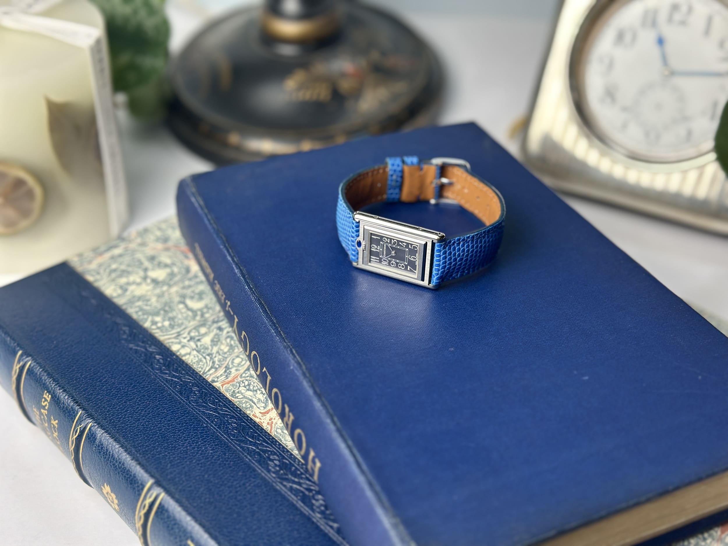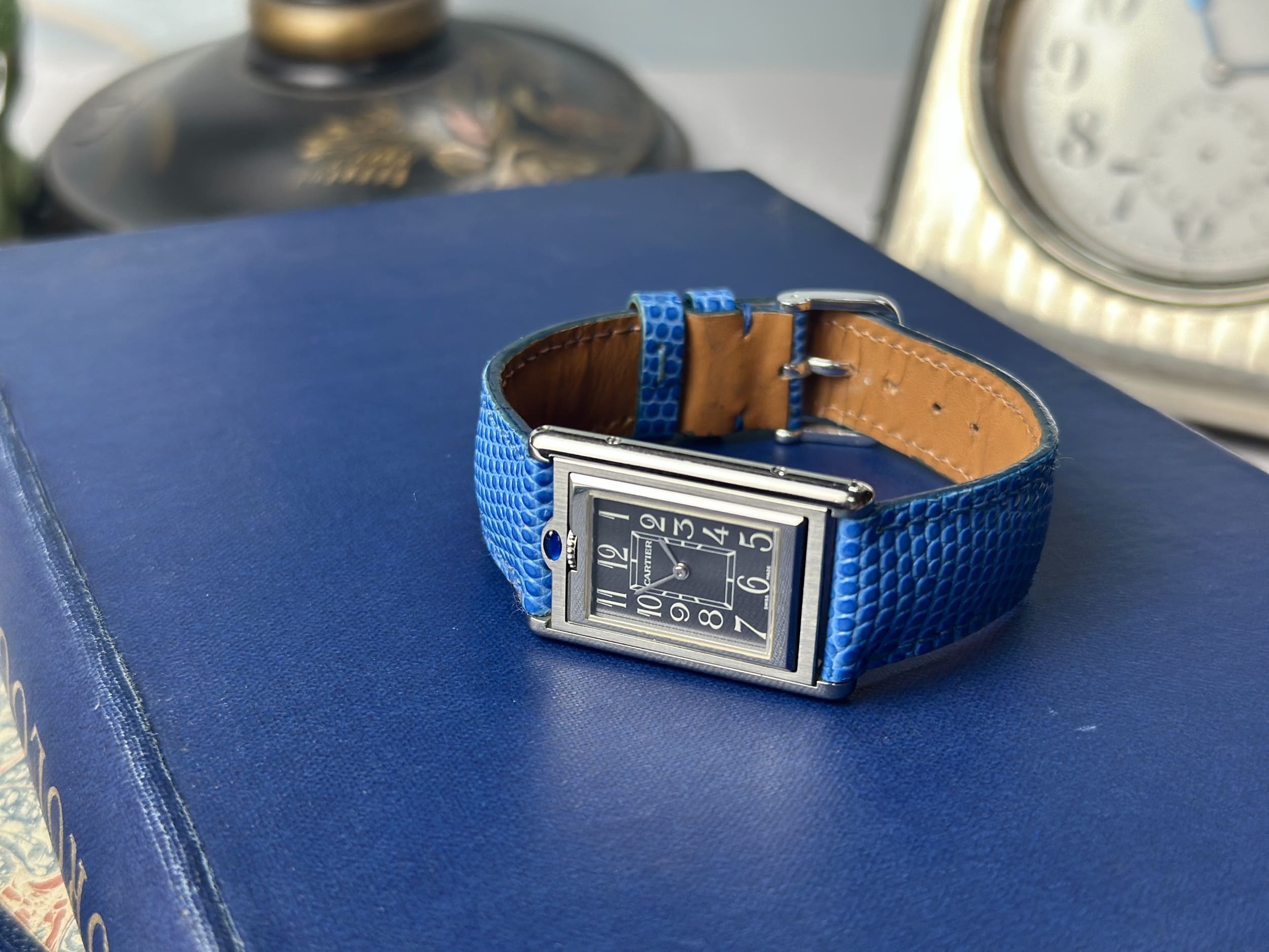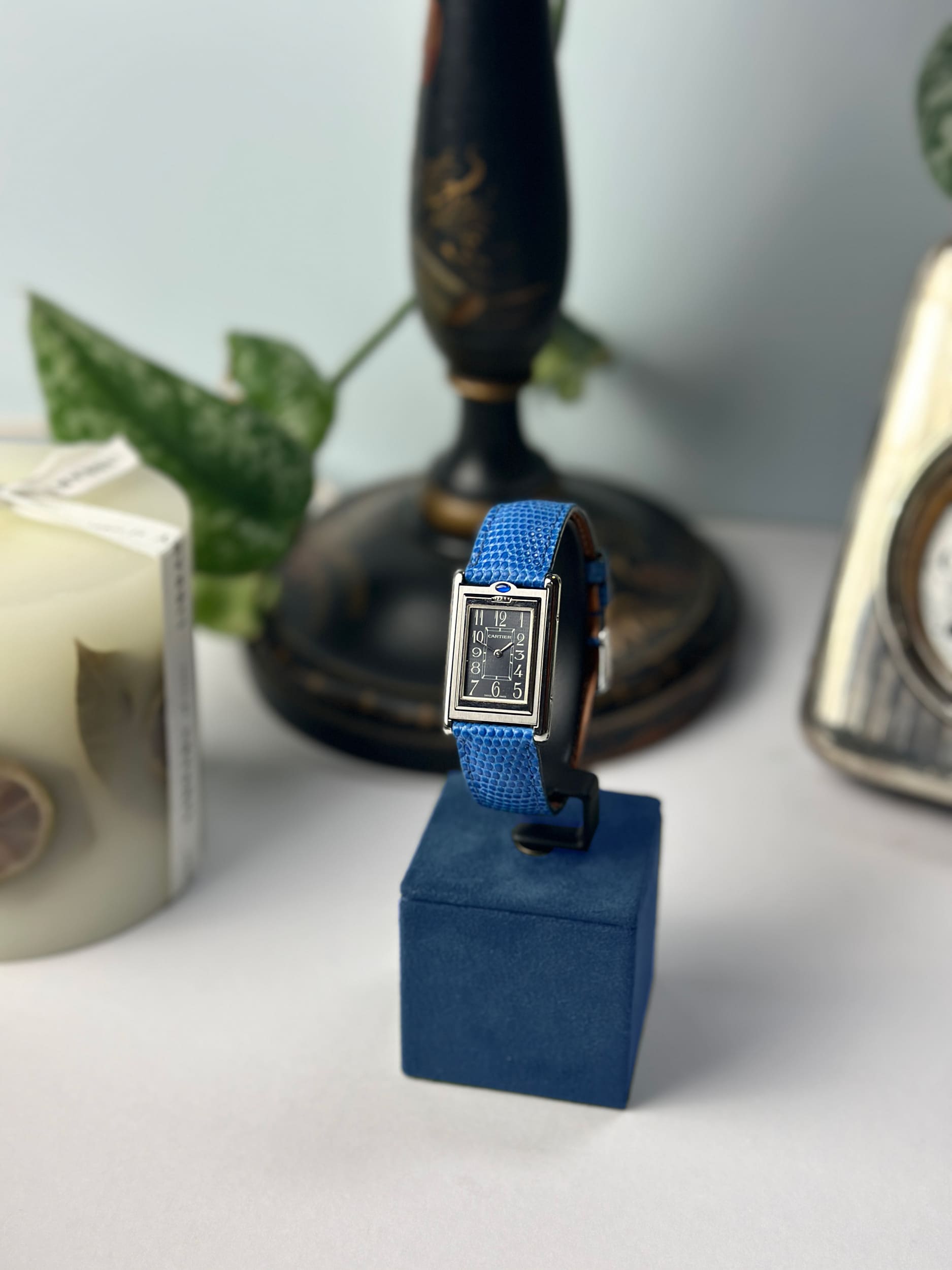 The ref. 2405 was reintroduced in the 1990s as part of the Collection Privée Cartier Paris (CPCP) era, a period in which Cartier revived historically important designs from its archives. The case is slim, rectangular, and finely detailed, with classic Art Deco proportions and subtle gadrooning along the top and bottom. Its deep black dial features painted Arabic numerals in a crisp, vintage-inspired font, paired with a chemin-de-fer minute track and simple baton hands, reflecting Cartier’s signature design language with clarity and restraint.