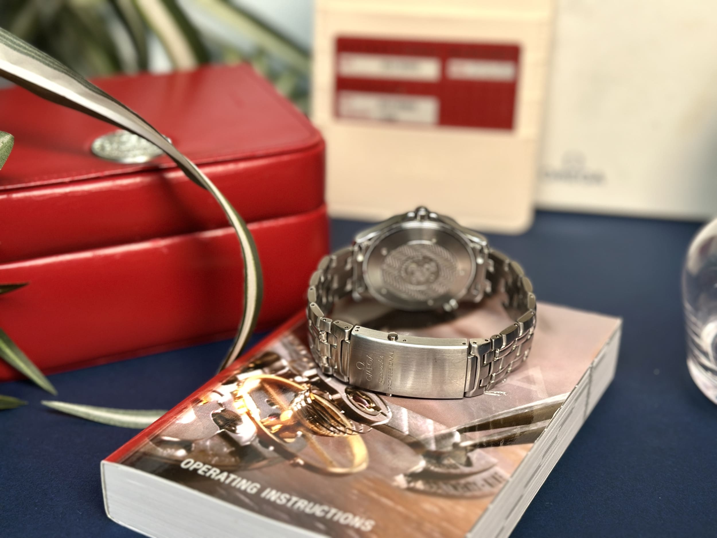 At its heart lies the Omega Calibre 1538 quartz movement, selected for its proven reliability, precision, and suitability for active daily wear. During the 1990s, high-grade quartz was not a compromise but a deliberate technical choice, offering exceptional accuracy and robustness with minimal maintenance. The crisp sword hands, luminous hour markers, and clear minute track reflect the functional priorities of a true diver’s instrument, while the balanced proportions of case and bracelet lend the watch an enduring versatility beyond its underwater capability. The reference 2541.80.00 thus occupies an important place within the Seamaster lineage, bridging professional utility and contemporary design language.